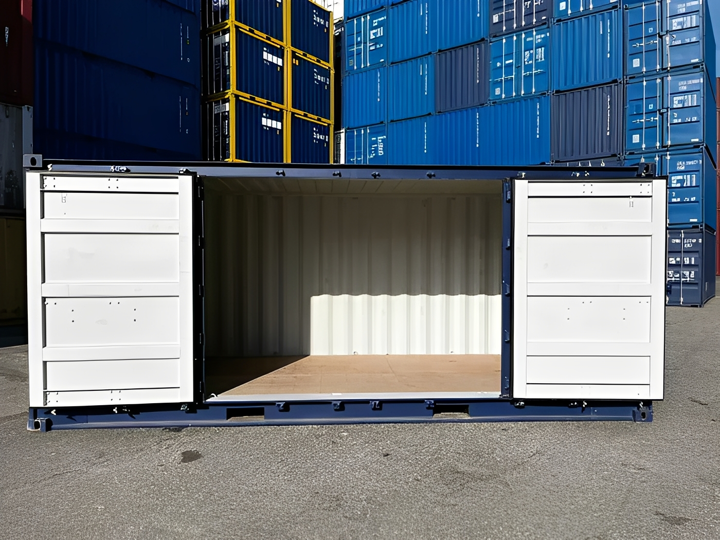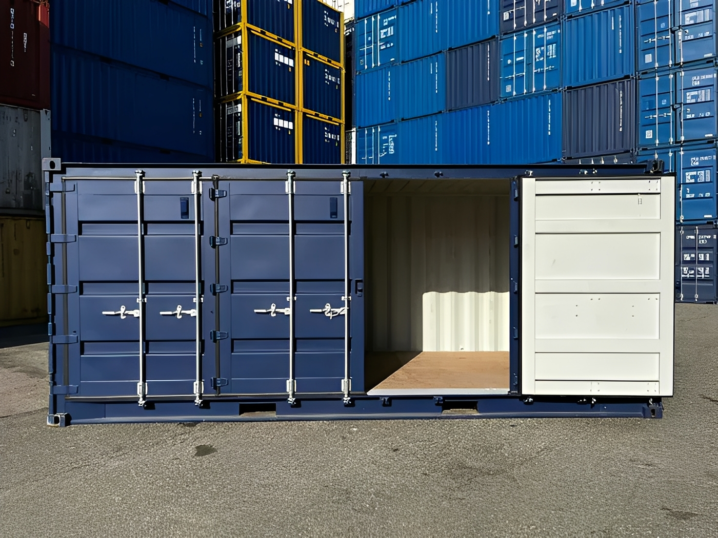 Unlike standard shipping containers, this model features a unique design with full-length container doors along one entire long side in addition to the traditional double doors at the end.